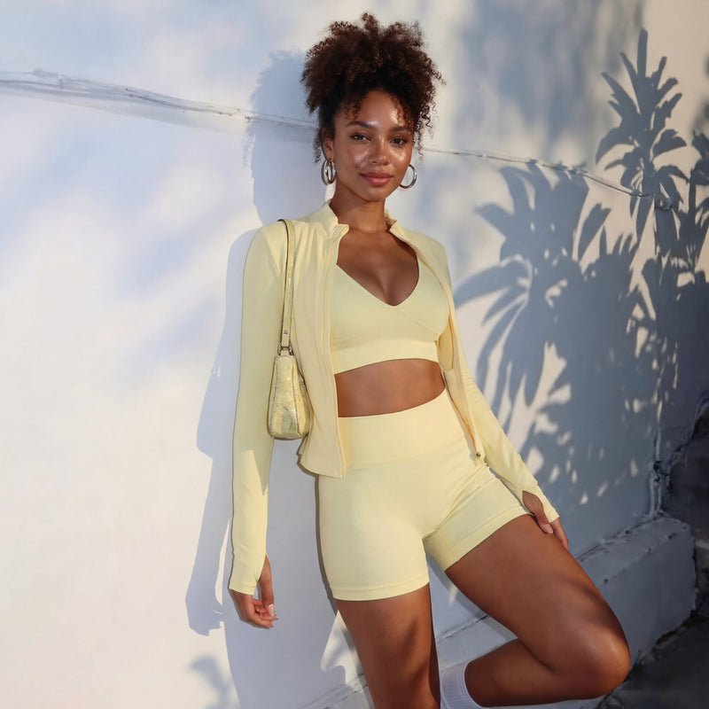 - Features a short-sleeve, cropped design with elegant contoured seams.